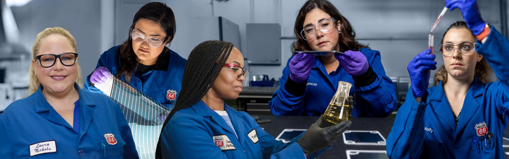 (Pictured at top, from left: Laura Nichols, Lab Director at the Phillips 66 Sweeny Refinery; Alyssa Chinen-Mendez, Batteries Team Lead for Energy Research & Innovation at Phillips 66; Yvette Lemon, Chem Tech at Sweeny Refinery; Whitney Spencer, Technician for Energy Research & Innovation; Molly Merritt, Technician, Lubricants R&D.)